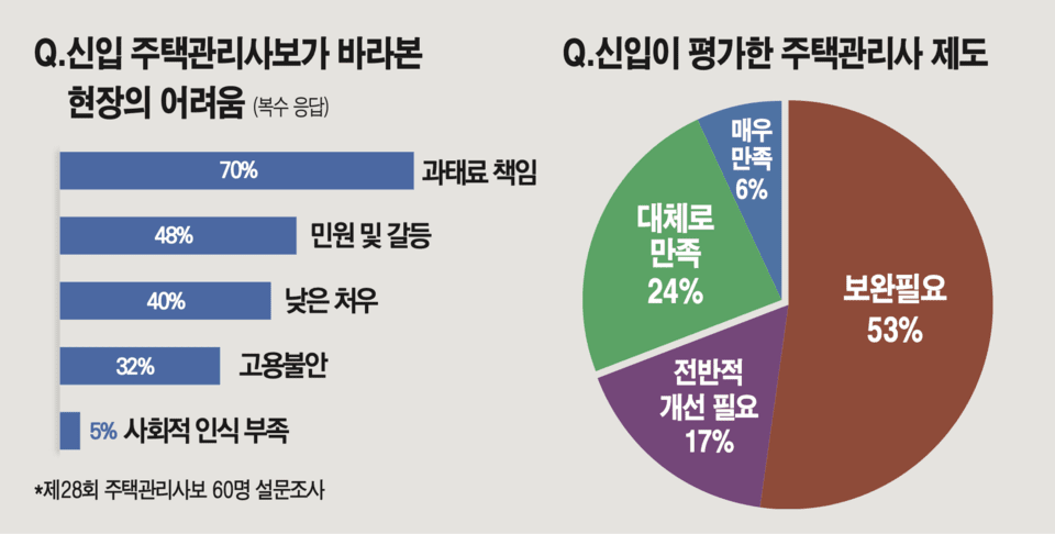 한국아파트신문이 최근 종합교육기업 에듀윌 실무아카데미를 수료한 제28회 주택관리사보 자격시험 합격자 60명을 대상으로 설문조사를 실시한 결과 70%가 주택관리사의 가장 큰 어려움(복수 응답)으로 ‘과태료 등 법적 책임 부담’을 꼽았다. 현장 진입을 앞둔 응답자들은 이어 △과도한 민원과 갈등(48%) △업무 대비 낮은 처우(40%) △단기 계약 등 고용불안(32%)을 걱정거리로 여겼다.