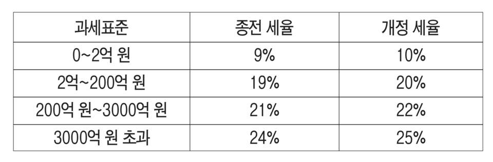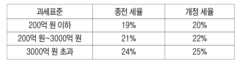- 일반 내국법인의 경우 법인세 과세표준 구간 중 2억 원 이하는 10%, 2억 원 초과 200억 원 이하는 20%, 200억 원 초과 3000억 원 이하는 22%, 3000억 원 초과는 25%로 법인세율을 각각 1%p씩 인상